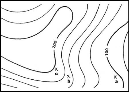 有些時候需要確定一個地點更精確的高度,要做到這一點,你必須確定點距離兩個等高線之間有多遠。而大多數軍事需求被估計地點高度符合較接近的等高線(下圖)