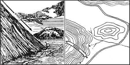 4.凸坡:在地圖上凸坡的地形特徵是頂部等高線間隔較寬,底部等高線間隔緊密。在斜坡的頂部無法觀察到底部斜坡或地形