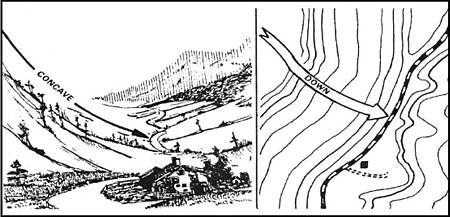 3.凹坡:在地圖上凹坡的地形特徵是頂部等高線間隔緊密,底部等高線間隔較寬。在斜坡的頂部可以觀察到整個坡地