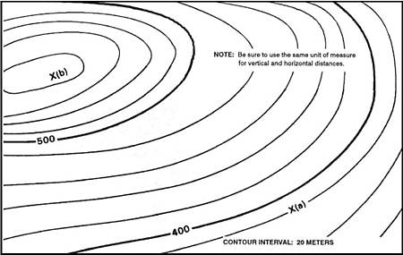 要確定一個坡度的百分比,我們必須知道斜坡的VD。VD從斜坡最高點減去最低點確定。使用等高線線,以確定最高和最低點的斜率