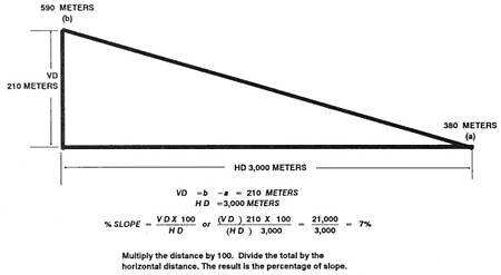要確定在下圖點(a)和(b)之間的斜率的百分比,確定(b)點高度(590公尺)。然後確定(a)點高度(380公尺)。從(b)點高度通過減去(a)點高度確定兩個點之間垂直距離的差值(210公尺),是點(a)和(b)之間的VD