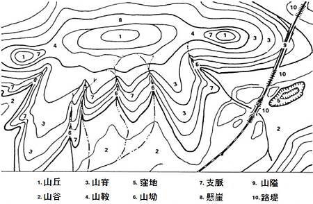 地形特徵通常不會獨立存在。他們被描繪在地圖上,為了更好地了解這些地形特徵,通過使用等高線、SOSES方法、山脊線或溪流線,需要對其進行解讀
