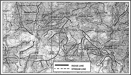 (3)回到在每個主要的山脊線和追踪超過突出的山脊和支脈表示出來的山脊線