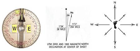 •地圖上的許多南北向線條給出網格北。指南針的指針指向磁北。網格北和磁北通常有幾度的差別。兩者都不是直接對正點在北極;北極被稱為“真北”