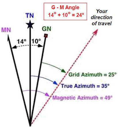 •網格北:這是通過使用地圖上的垂直網格線建立了北方。用字母GN標誌。UTM網格其準確性及簡單,用於軍隊和救援隊