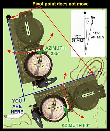 2.旋轉指南針直到取得地標方位角在採取的方位上