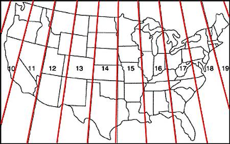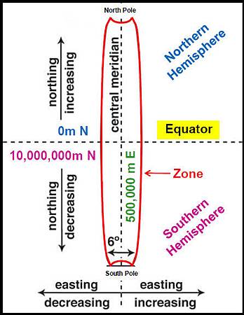 中央經線是提取每個區域中心的任意直線,並給予500,000公尺橫移假設值,因此,只有在該區域的正面橫向任何地方測量