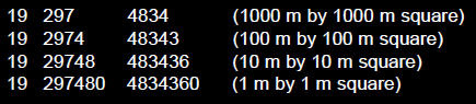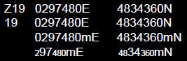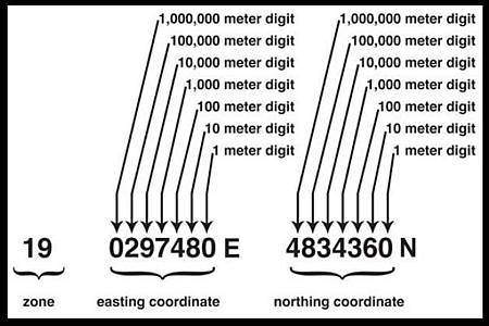 2. 座標位置也被簡寫為所需精確度的程度;例如,UTM Z19 0297480E 4834360N: