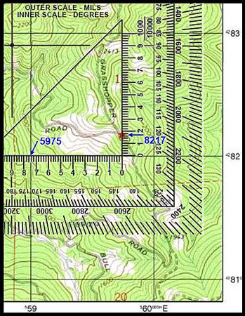 3.使用軍用量角器水平刻度對準82方形水平網格線,向左或向右移動,直到垂直刻度對準了你的位置(★)