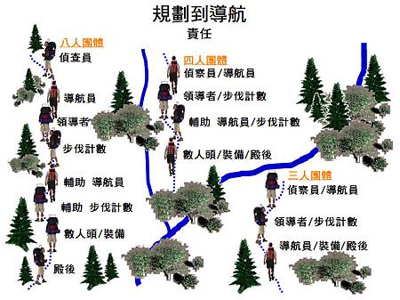 ˇ#1偵察員(要點人):選擇最佳的路徑(立足點)、避免落石、鬆散的岩石、危害。不走的快和經過障礙物時等待,並讓大家在移動之前趕上