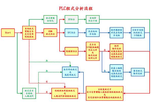 b.若是是SFC的寫法,分析比較簡單,不過依PLC廠牌和使用軟體的新舊版會有一定的難度;例如三菱PLC舊版軟體FXGPWIN和新版軟體GPPW或GX Works寫的SFC程式就有很大的差別,歐姆龍PLC寫的SFC也有自己的語法