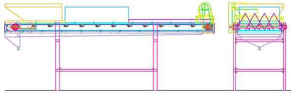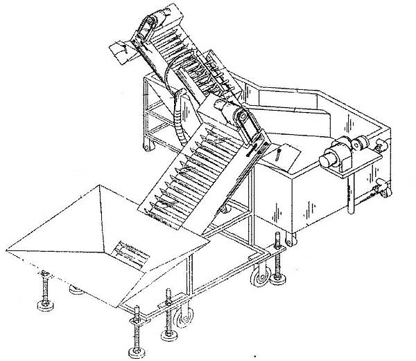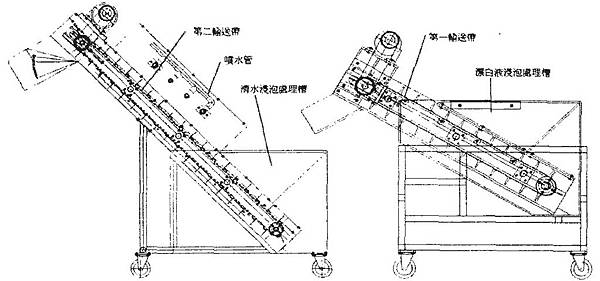 設計圖很簡單就只是一段直線的白鐵網輸送帶,前段是入料斗,中段是噴藥水區,尾段是讓藥水滴落回收區段,最下方是2mm厚的白鐵製藥水槽