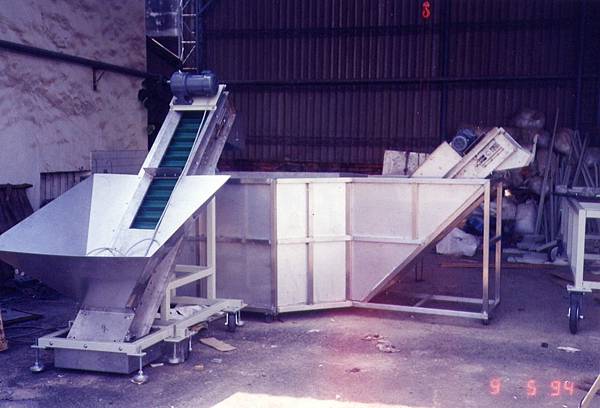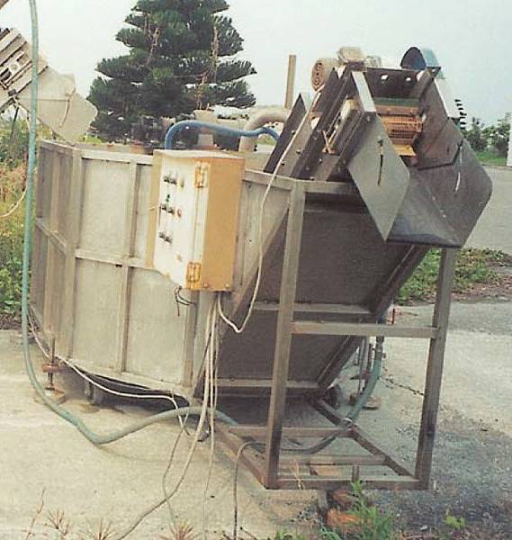 聽到他的回答我就請他提供調配好的藥水來測試材料,幾天後他拿來的是很混濁灰白色使用過的藥水。拿到藥水後我就把公司內的小塊金屬廢料軸承等全丟進去,一星期後才全部撈出來清洗量尺寸。裡面除了白鐵外,其餘銅鋁鐵料軸承都有明顯腐蝕的現象,因此決定試驗機全部用白鐵製造,輸送帶使用白鐵網,連泵浦、噴水頭和軸承及螺絲也全部是白鐵做的