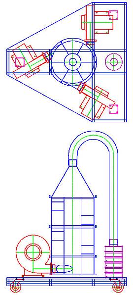 雖說是把"旋風集塵機"反過來用,但實際上新鮮葉片重量不輕,實際用到的有3台鼓風機。另外為了能看到內部葉片旋轉的狀態,一開始教授就確定機器外殼必需是透明的