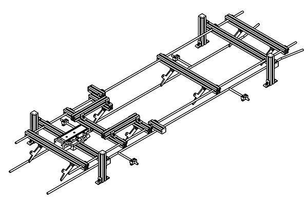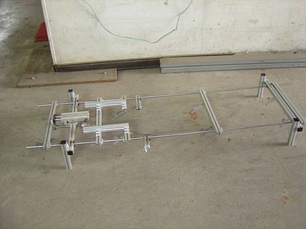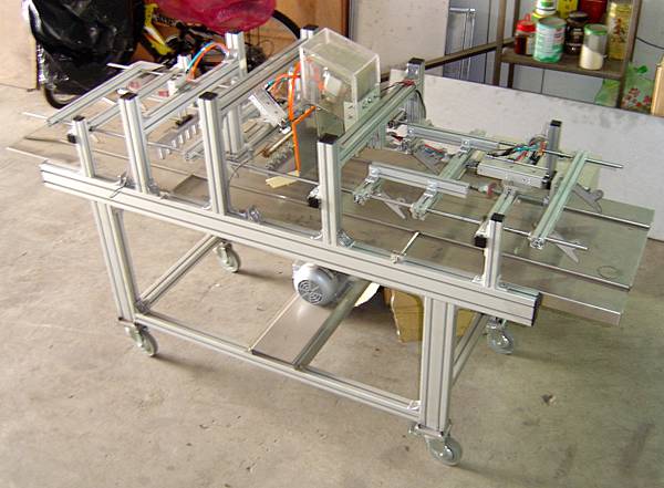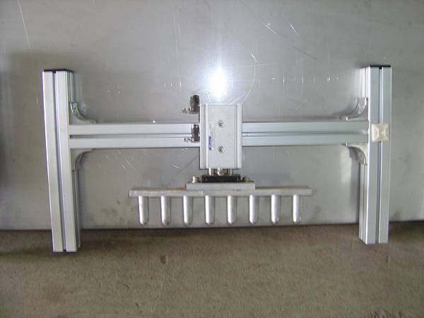 輸送穴盤機構使用勾爪推動是完全仿製,就如下圖所看到的有4對勾爪,要更換不同尺寸穴盤就必需全部調整;台灣農民使用的穴盤種類尺寸之多可算是世界第一,光128格穴盤我手邊有紀錄的就有35種尺寸,穴盤最長和最短尺寸相差達6公分,最寬和最窄尺寸相差達14公分。如此大的差距範圍要用勾爪結構去包括在內幾乎是不可能,事實上在設計階段就捨棄了最大和最小尺寸,只根據最多人用的那幾種規格設計;但農民在更換穴盤時還是嫌調整麻煩,於是就有像紫X農場這樣有點錢的農民採購多台,分別調好對應不同尺寸的穴盤