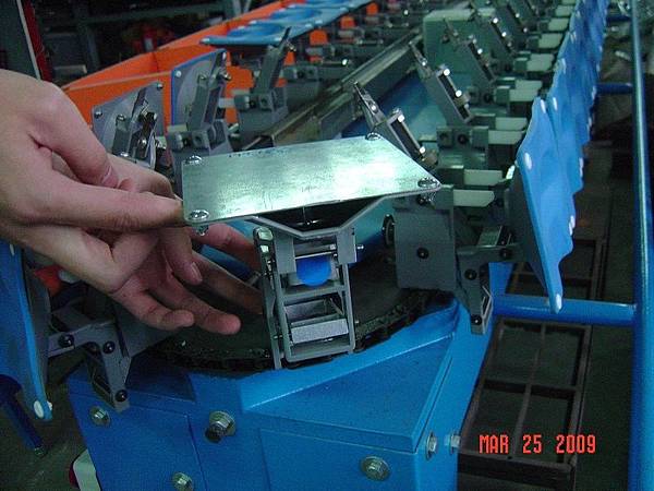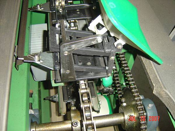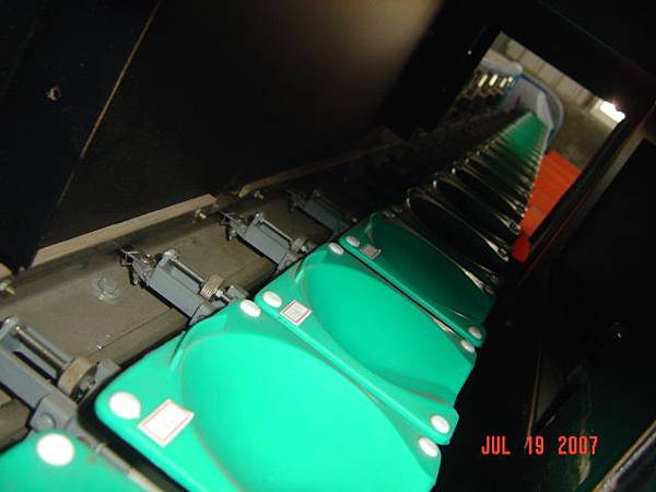 我是一直覺得這種托盤雖然技術成熟,但對電子秤種來說卻不是最佳選擇;托盤在秤重的施力點上,透過連桿施加很大的壓力,和荷重元直接接觸的桿片因為這壓力,在進入和脫離荷重元量測區段都無可避免產生訊號的突波變化。雖然可以靠軟體技術來處理這個問題,但仍有其限制;這套設備荷重元量測區段只有12公分長,若輸送帶速度大於75顆/每分鐘,托盤經過造成的突波回穩時間扣掉後,剩不到1公分的距離可以抓秤重訊號。所以這套設備的速度被調整在65顆/每分鐘