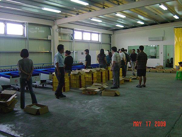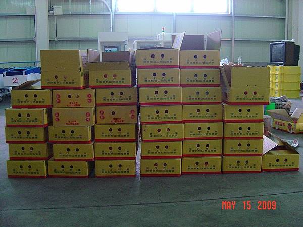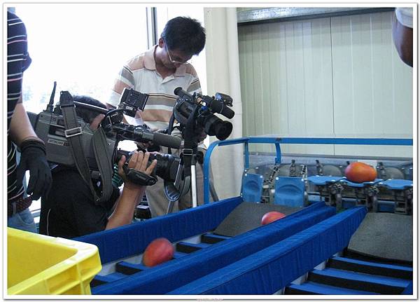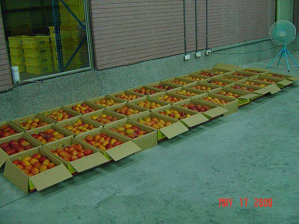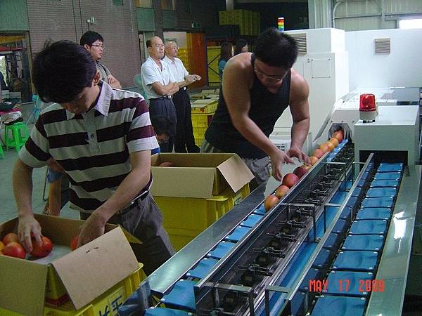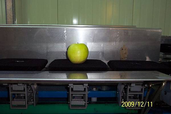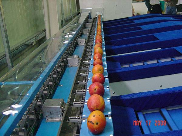 1.請廠商準備600顆大小不一的水果,每顆水果貼上標籤編號,用機器跑過一遍,期間若出現故障時,排除故障時間需少於5分鐘;這部分有先向官員提出異議,600顆水果分級後每個分級槽容量一定超過上限,到時水果被輸送帶撞壞算不算故障。經過協調台X縣政府請安裝場地人員幫忙,將每個分級槽的水果裝箱,按照分級一一排好
