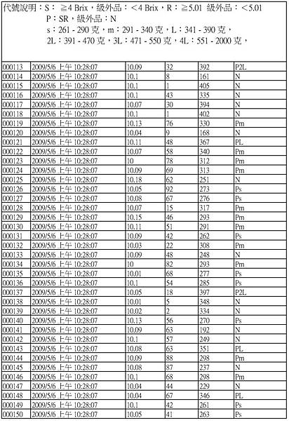 2.分級不穩定,所觀察到的同一顆水果每次分級時落在不同分級槽。如果每次分級都是在相鄰兩槽間切換,還可以解釋成那顆水果的檢測值剛好在分級的臨界點上(機器檢測一定會有正負誤差),但相差3到4槽時就不知道該如何解釋。與會的其他廠商顯然也注意到了這一點,不過因為不了解分級程式及標準是如何設定的,所以大家在會後討論時都閉口不談