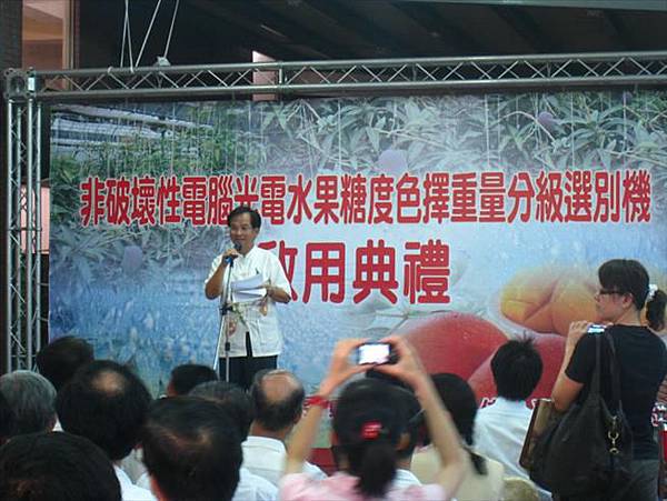 典禮最後有農民要求解剖實測糖度是否準確。選取的那顆水果是從外銷的箱中拿來的,在機器螢幕上顯示16.7度,我嚇了一跳,因為驗收前取樣的樣本最高也有16.2度,超過16度的樣本不到10顆。幸好解剖實測的糖度是16.6度誤差很小,典禮主持人乘機宣傳說這機器是通過了最嚴格的驗收,和國外的相比毫不遜色。縣長和農委會官員看到結果,表情也像是如釋重擔,平安結束啟用典禮