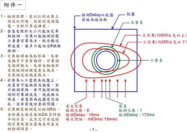 這套設備主要要驗收的水果是長橢圓形,依機器的速度每顆水果平均可測6次糖度,驗收前是全部相加取平均值為那顆水果的糖度。但水果頭和尾糖度相差很大,用藥催熟的差異會比自然熟的差更大,平均差是1到2度,最大有4度以上。若這6次中剛好有遇到大的炭疽病黑斑,那次的數值有可能為0。第1次驗收失敗後,把解剖過的水果分析得知以上的差異