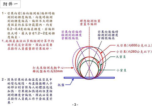 最後來說這套設備測糖度到底準不準?撇開溫度的影響不談,若是IR燈光打在水果哪裡就解剖那個位置來實測糖度,根據檢量線(數據建模)的計算結果,可以保證有92%以上準確率。那為什麼達不到呢?以一個示意圖來說明,主要要驗收的水果是長橢圓形,'放偏斜會不會準?也會準,但實際上驗收時很多是測頭頂剖肚子,那樣誤差就出來了,所以在第2次以後的驗收放水果都由廠商自理