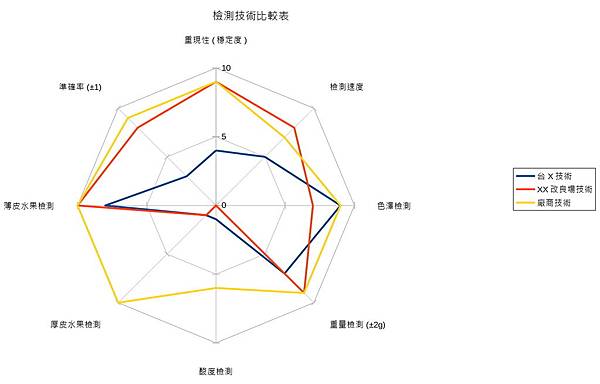 取樣波段來說台X規格說是採用350到900nm,我是很納悶糖度檢測怎麼會用到可見光的波段?不過教授一再強調這就是台X規格的技術。我不懂台X規格技術的細節,但就所觀察到的,這個技術會受水果顏色影響,同樣糖度的水果,紅色程度不同測出的結果就不同