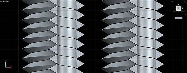 建立螺絲的螺牙時,因為螺旋線的螺旋角差異很小,所以看不出差別。左邊有截面自動垂直對齊螺旋線端點,可以稍微看出中心斷面不是完全的直線。右邊沒有截面自動垂直對齊螺旋線端點,中心斷面是完全的直線;或許有人覺得沒差,但在做差集或交集運算時就是成功失敗的關鍵