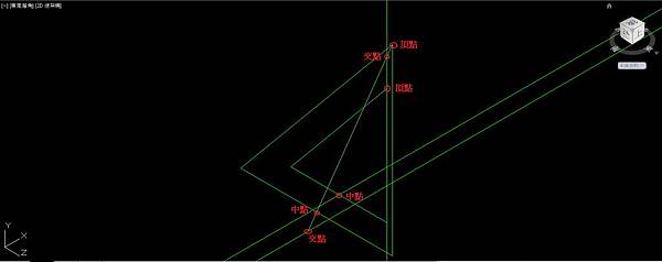 刪除平行面和內側的面域,在外側三角形頂點和底邊中點畫直線,延伸直線在垂直和水平建構線各產生交點
