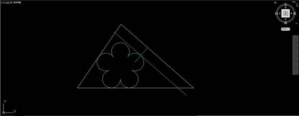 刪除2條輔助線;以右上角圓弧圓心為起點,畫輔助線垂直於三角形50邊;使用偏移指令,以輔助線和圓弧交點為目標,偏移三角形50邊,當作是斜輔助線