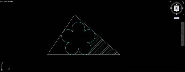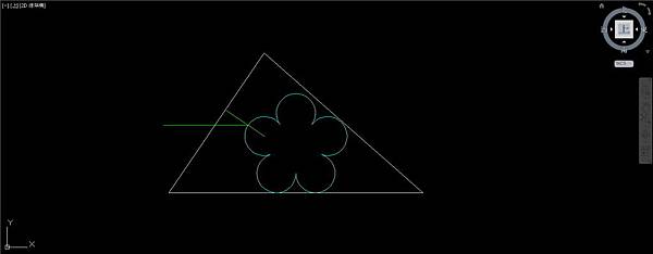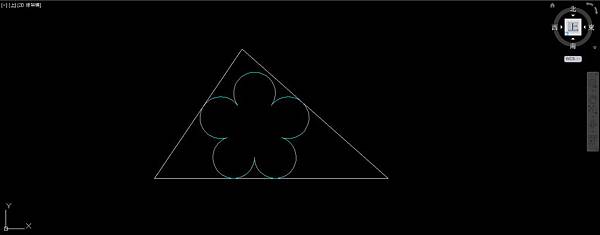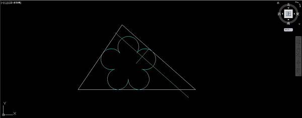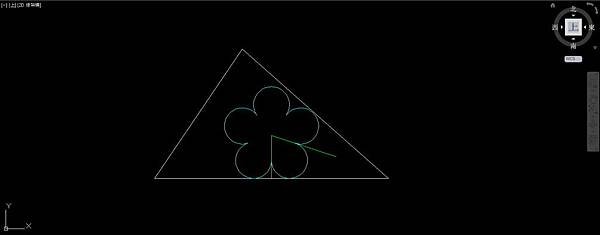 以60底邊左端點為基準點,左端點到斜輔助線交點的距離為參考長度,以60底邊右端點為新長度,使用比例指令放大5個圓弧,使右上角圓弧和三角形50邊相切