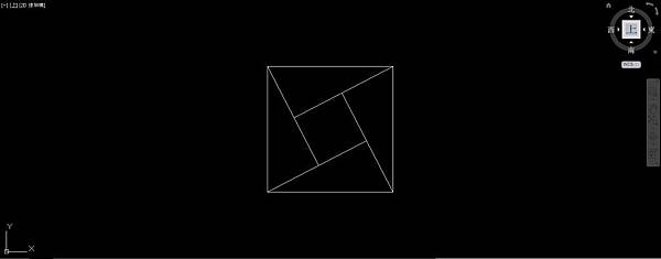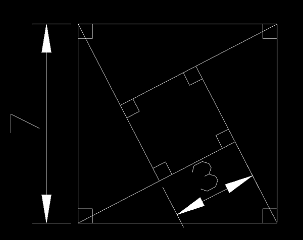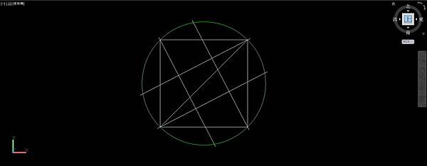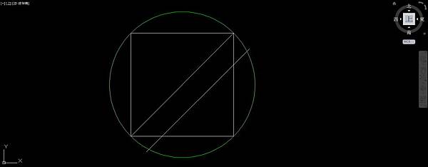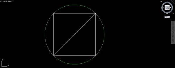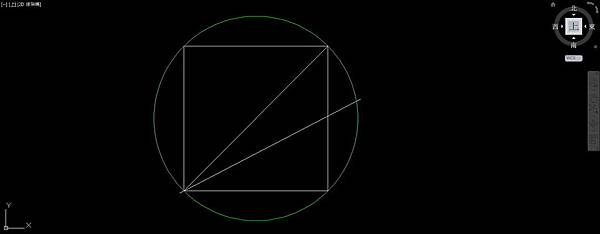 先用矩形指令畫一個邊長為7的正方形,再以直線連接正方形左下和右上兩個端點畫對角線;以對角線中點為中心,正方形端點為半徑畫輔助圓