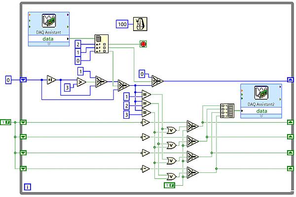 使用USB-6501輸出通道P2的P2.0到P2.3接點取代程式中的布林元件Boolean1到Boolean4